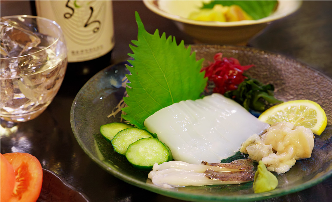 いかの刺身のような素材の味を活かした料理にも。それぞれの甘みが相まって、口の中ですっと米の余韻が広がります。