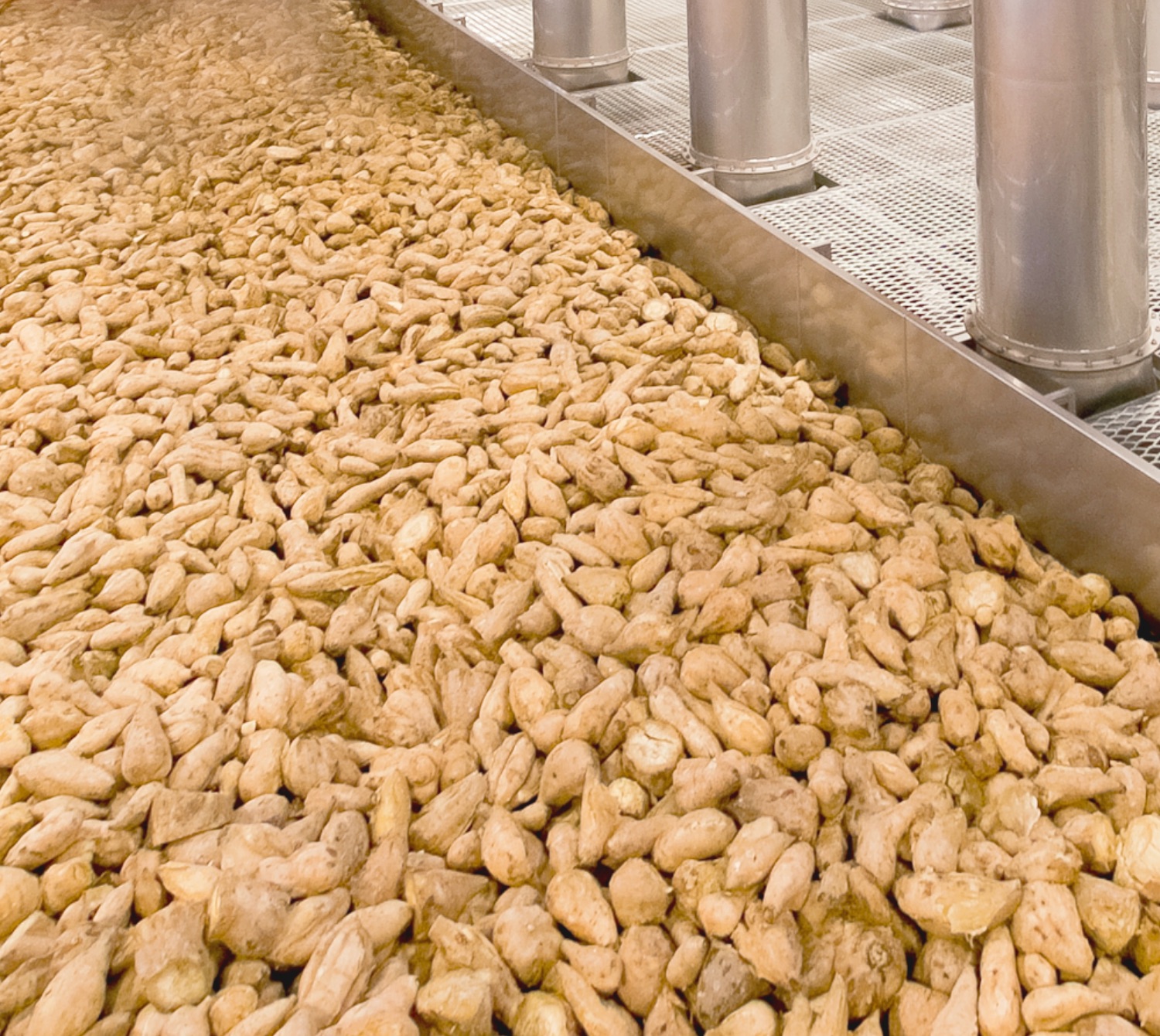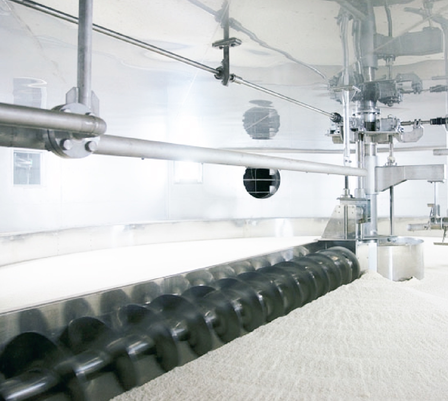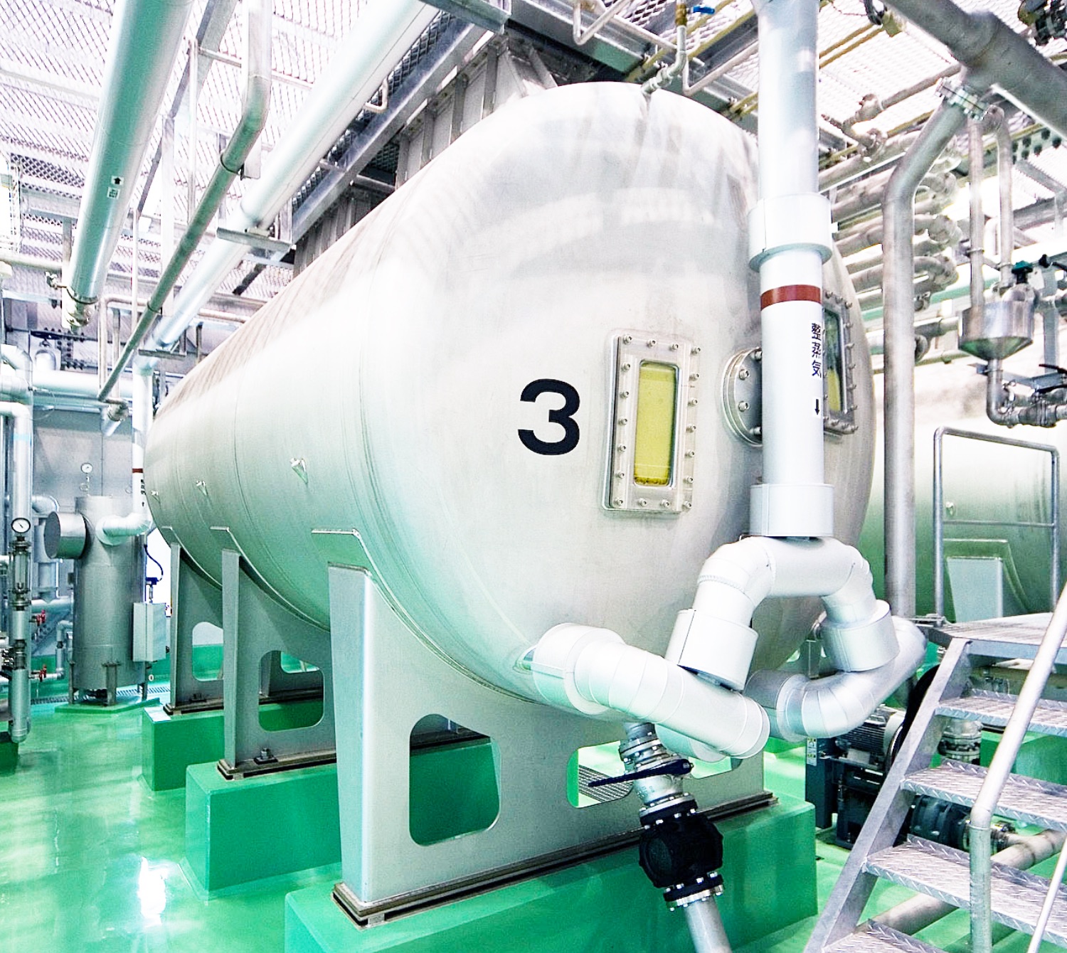 고구마를 연속찜기로 안쪽의 온도가 91도가 되도록 약 1시간에 걸쳐 쪄서 발효하기 쉬운 상태로 만듭니다.