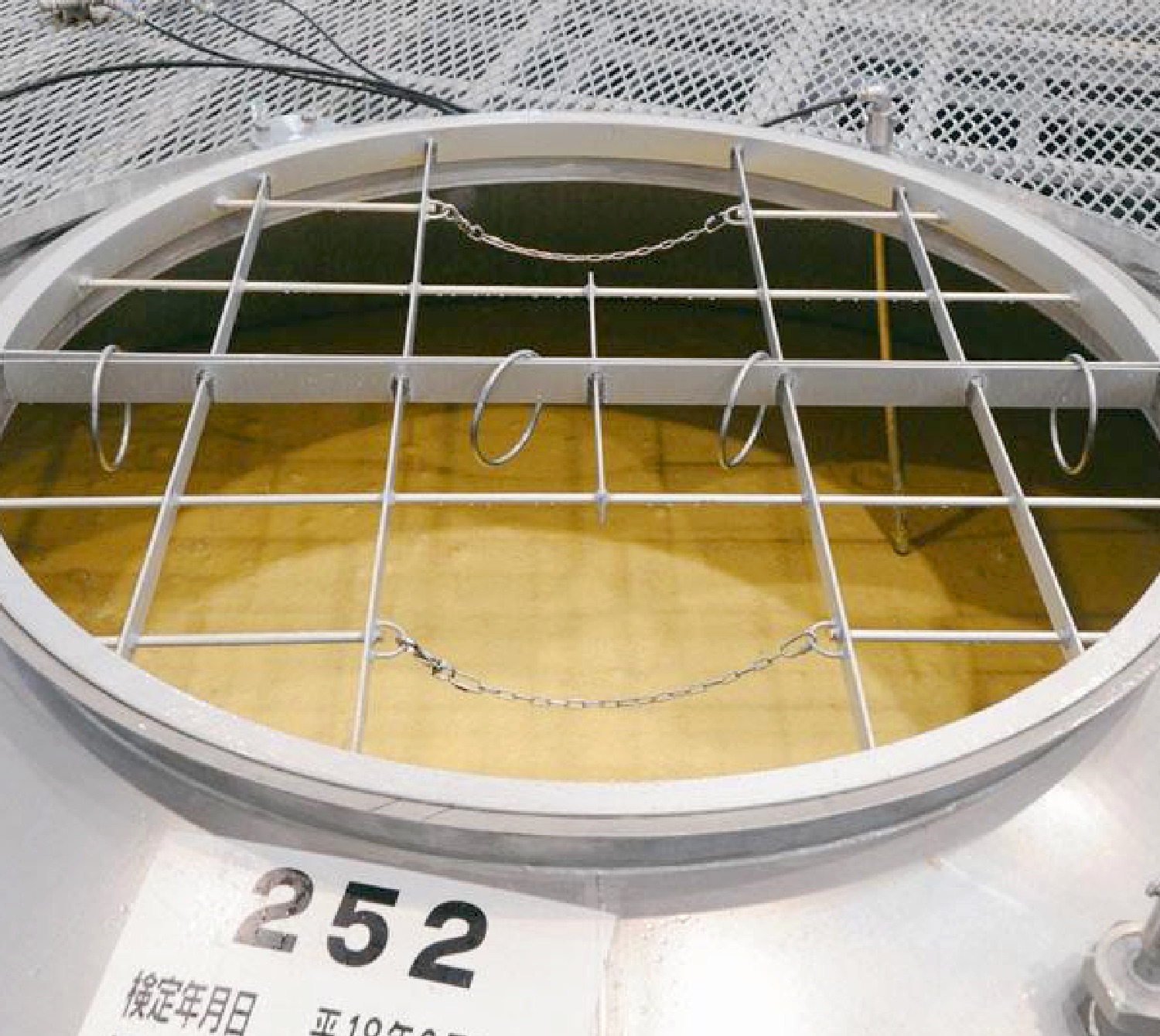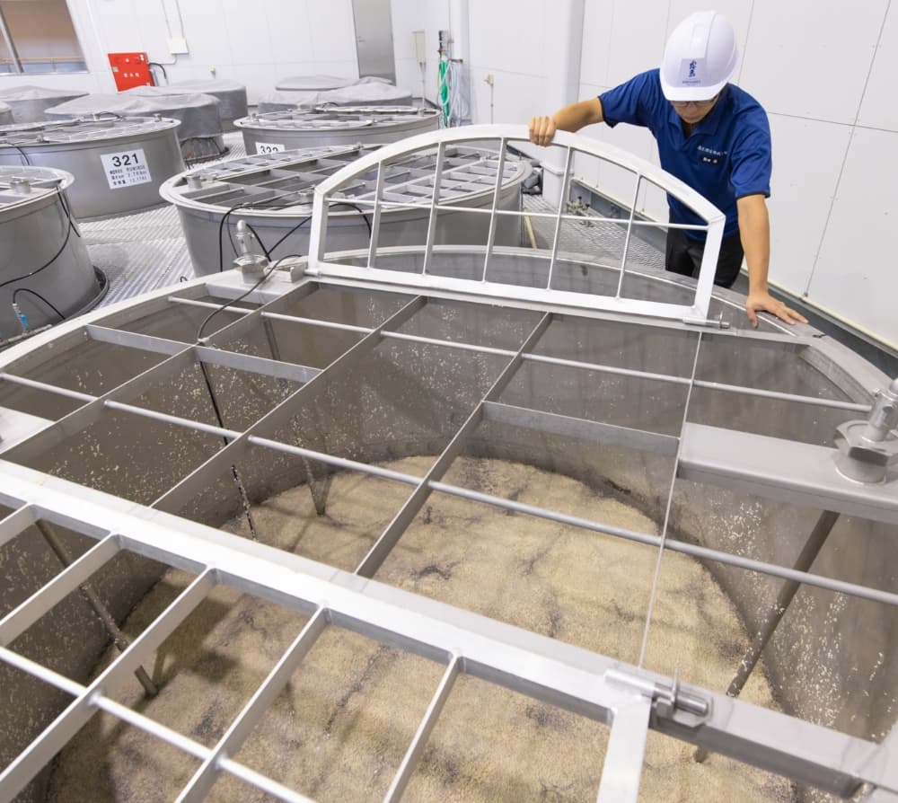 1차 발효 작업은 술(酒)과 어머니(母)라는 글자를 함께 써서 슈보(酒母)라고 불리는 전국(거르지 않은 술) 을 만드는 공정입니다. 11차 발효 탱크에 국균과 기리시마 열하수를 투입하여 효모균을 넣습니다. 국균의 효소에 의해 분해된 당을 영양분으로 삼아 효모균이 증식하여 알코올과 이산화탄소를 생성합니다. 약 5일 정도 지나면 알코올분이 약 14%인 1차 전국가 완성됩니다.